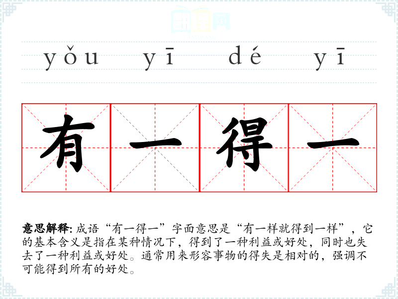 成语“有一得一”字面意思是“有一样就得到一样”,它的基本含义是指在某种情况下,得到了一种利益或好处,同时也失去了一种利益或好处。通常用来形容事物的得失是相对的,强调不可能得到所有的好处。
