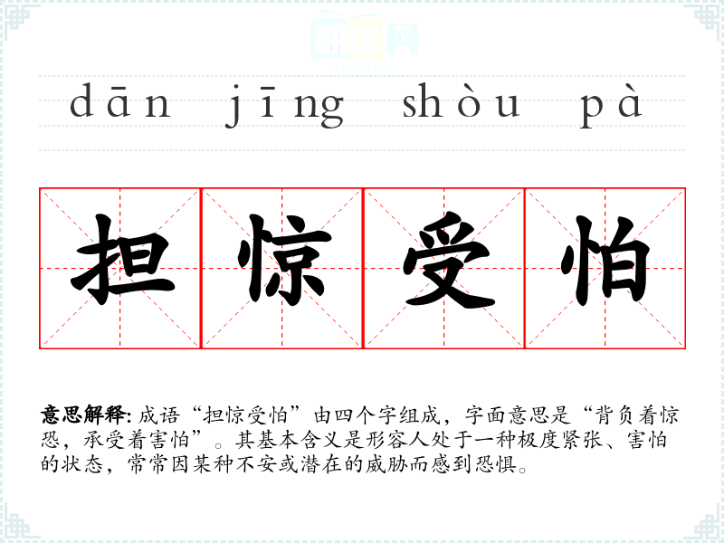 成语“担惊受怕”由四个字组成,字面意思是“背负着惊恐,承受着害怕”。其基本含义是形容人处于一种极度紧张、害怕的状态,常常因某种不安或潜在的威胁而感到恐惧。