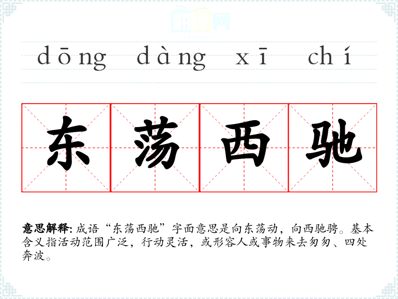 成语“东荡西驰”字面意思是向东荡动,向西驰骋。基本含义指活动范围广泛,行动灵活,或形容人或事物来去匆匆、四处奔波。