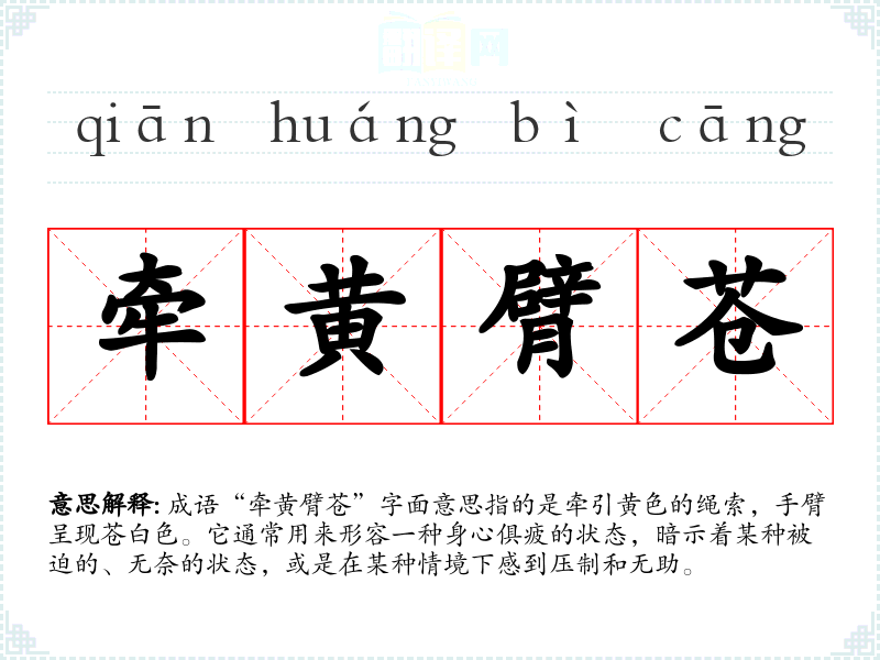 成语“牵黄臂苍”字面意思指的是牵引黄色的绳索,手臂呈现苍白色。它通常用来形容一种身心俱疲的状态,暗示着某种被迫的、无奈的状态,或是在某种情境下感到压制和无助。