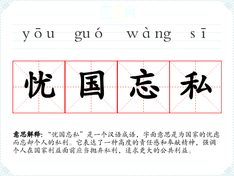 “忧国忘私”是一个汉语成语,字面意思是为国家的忧虑而忘却个人的私利。它表达了一种高度的责任感和奉献精神,强调个人在国家利益面前应当抛弃私利,追求更大的公共利益。