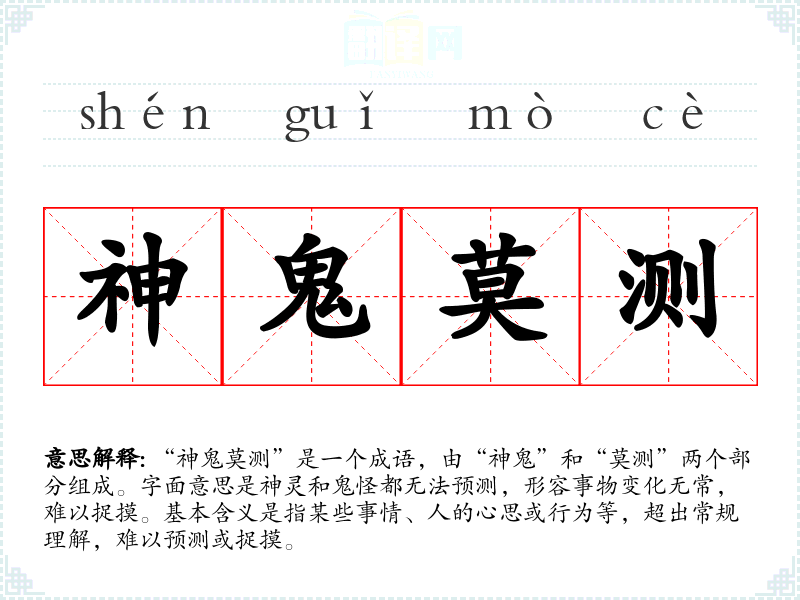- 文学作品:在小说、诗歌中用来描绘神秘的环境或人物,例如描写一个复杂的人物内心时,可以使用“神鬼莫测”来形容其深不可测的情感。
