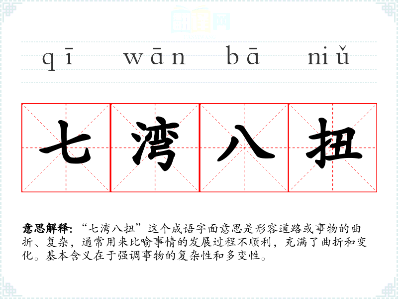 “七湾八扭”这个成语字面意思是形容道路或事物的曲折、复杂,通常用来比喻事情的发展过程不顺利,充满了曲折和变化。基本含义在于强调事物的复杂性和多变性。