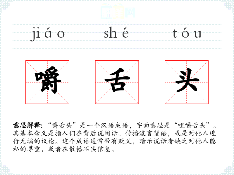 “嚼舌头”是一个汉语成语,字面意思是“咀嚼舌头”。其基本含义是指人们在背后说闲话、传播流言蜚语,或是对他人进行无端的议论。这个成语通常带有贬义,暗示说话者缺乏对他人隐私的尊重,或者在散播不实信息。