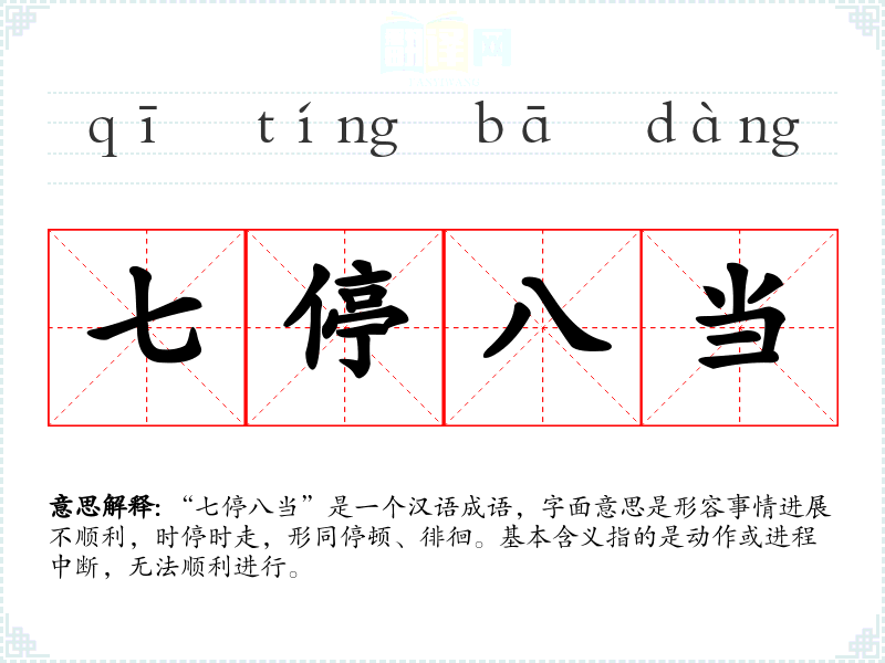 “七停八当”是一个汉语成语,字面意思是形容事情进展不顺利,时停时走,形同停顿、徘徊。基本含义指的是动作或进程中断,无法顺利进行。