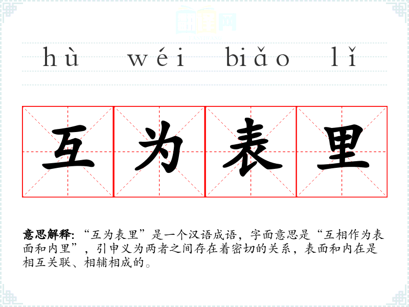 “互为表里”是一个汉语成语,字面意思是“互相作为表面和内里”,引申义为两者之间存在着密切的关系,表面和内在是相互关联、相辅相成的。