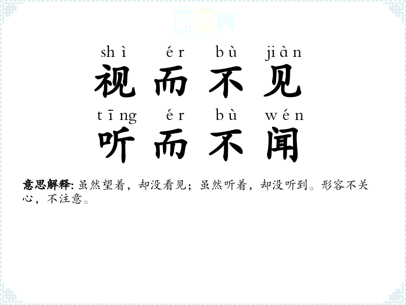 看见了同没有看见一样,听见了同没有听见一样。形容不重视,不注意。同“视而不见,听而不闻”。 |