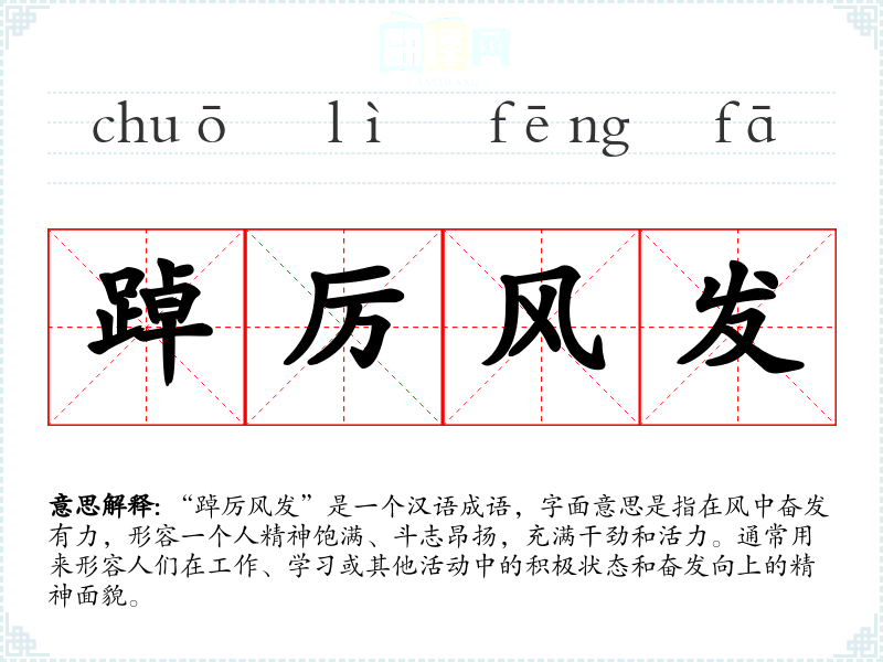 “踔厉风发”是一个汉语成语,字面意思是指在风中奋发有力,形容一个人精神饱满、斗志昂扬,充满干劲和活力。通常用来形容人们在工作、学*或其他活动中的积极状态和奋发向上的精神面貌。