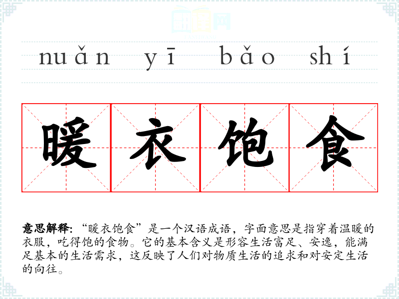 “暖衣饱食”是一个汉语成语,字面意思是指穿着温暖的衣服,吃得饱的食物。它的基本含义是形容生活富足、安逸,能满足基本的生活需求,这反映了人们对物质生活的追求和对安定生活的向往。