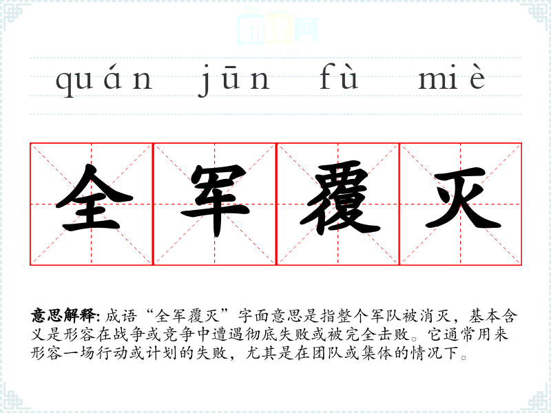 成语“全军覆灭”字面意思是指整个军队被消灭,基本含义是形容在战争或竞争中遭遇彻底失败或被完全击败。它通常用来形容一场行动或计划的失败,尤其是在团队或集体的情况下。