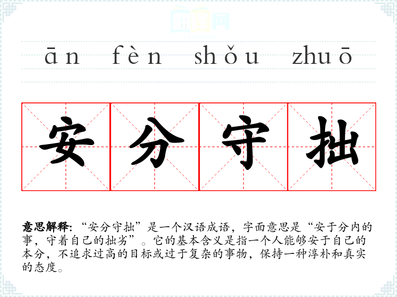“安分守拙”是一个汉语成语,字面意思是“安于分内的事,守着自己的拙劣”。它的基本含义是指一个人能够安于自己的本分,不追求过高的目标或过于复杂的事物,保持一种淳朴和真实的态度。