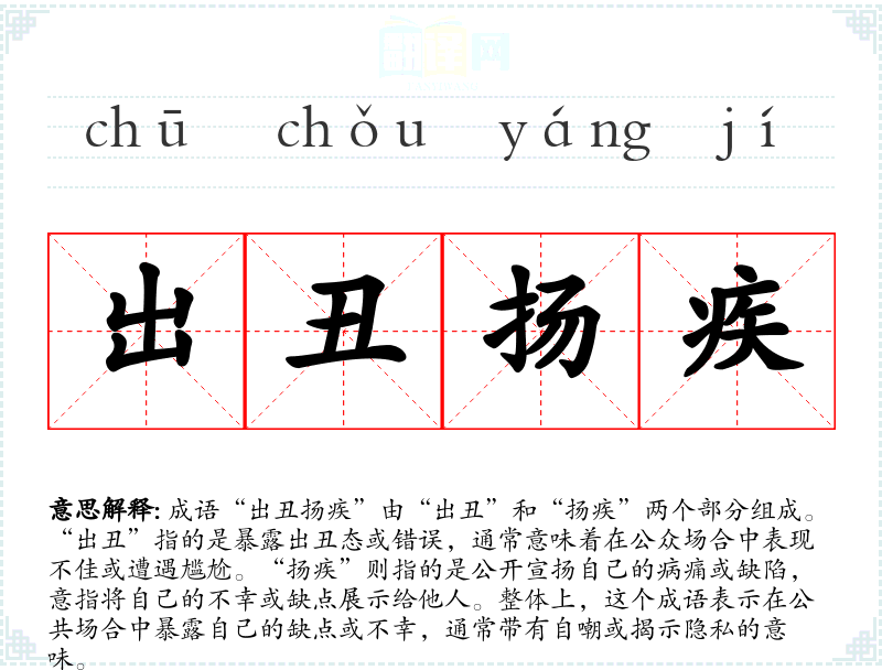 成语“出丑扬疾”由“出丑”和“扬疾”两个部分组成。“出丑”指的是暴露出丑态或错误,通常意味着在公众场合中表现不佳或遭遇尴尬。“扬疾”则指的是公开宣扬自己的病痛或缺陷,意指将自己的不幸或缺点展示给他人。整体上,这个成语表示在公共场合中暴露自己的缺点或不幸,通常带有自嘲或揭示隐私的意味。