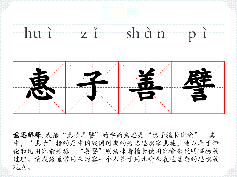 “惠子善譬”一词源于战国时期的哲学讨论,惠施是墨家的重要人物,也是逻辑学的先驱之一。在《墨子》中,有许多关于惠施使用比喻的记载。他通过生动的比喻来进行辩论,帮助人们理解复杂的哲学概念。因此,这个成语不仅反映了惠施的个性特点,也凸显了比喻在哲学和辩论中重要的作用。