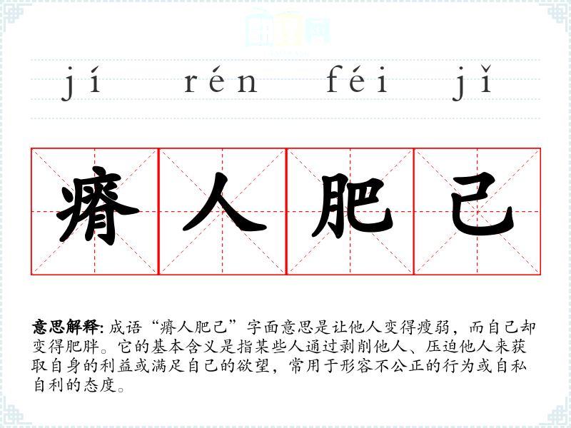 成语“瘠人肥己”字面意思是让他人变得瘦弱,而自己却变得肥胖。它的基本含义是指某些人通过剥削他人、压迫他人来获取自身的利益或满足自己的欲望,常用于形容不公正的行为或自私自利的态度。