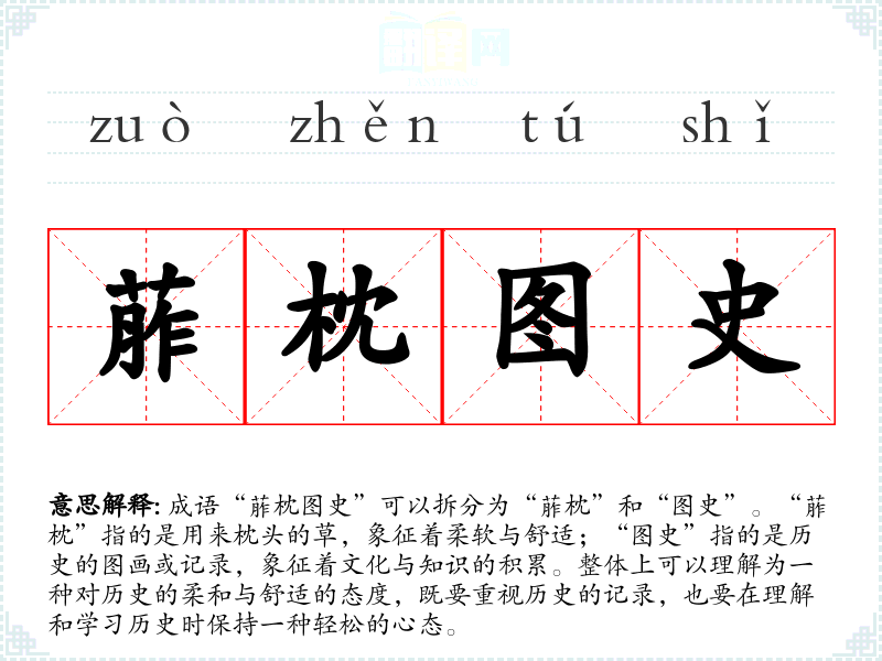 成语“葄枕图史”可以拆分为“葄枕”和“图史”。“葄枕”指的是用来枕头的草,象征着柔软与舒适;“图史”指的是历史的图画或记录,象征着文化与知识的积累。整体上可以理解为一种对历史的柔和与舒适的态度,既要重视历史的记录,也要在理解和学*历史时保持一种轻松的心态。