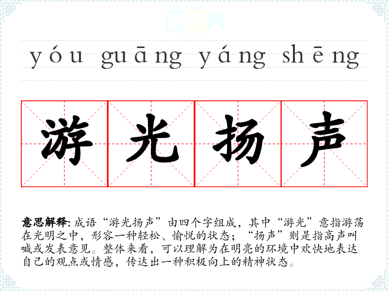 成语“游光扬声”由四个字组成,其中“游光”意指游荡在光明之中,形容一种轻松、愉悦的状态;“扬声”则是指高声叫喊或发表意见。整体来看,可以理解为在明亮的环境中欢快地表达自己的观点或情感,传达出一种积极向上的精神状态。