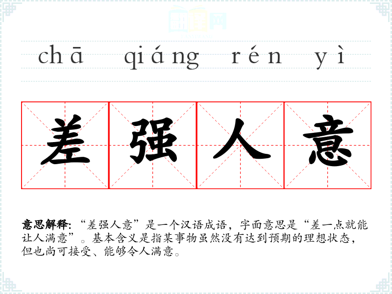 “差强人意”是一个汉语成语,字面意思是“差一点就能让人满意”。基本含义是指某事物虽然没有达到预期的理想状态,但也尚可接受、能够令人满意。