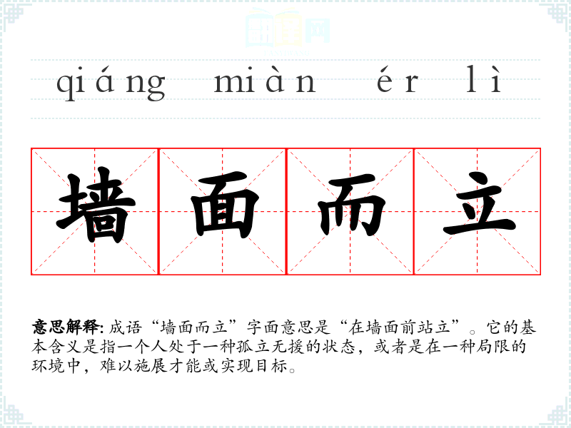 成语“墙面而立”字面意思是“在墙面前站立”。它的基本含义是指一个人处于一种孤立无援的状态,或者是在一种局限的环境中,难以施展才能或实现目标。