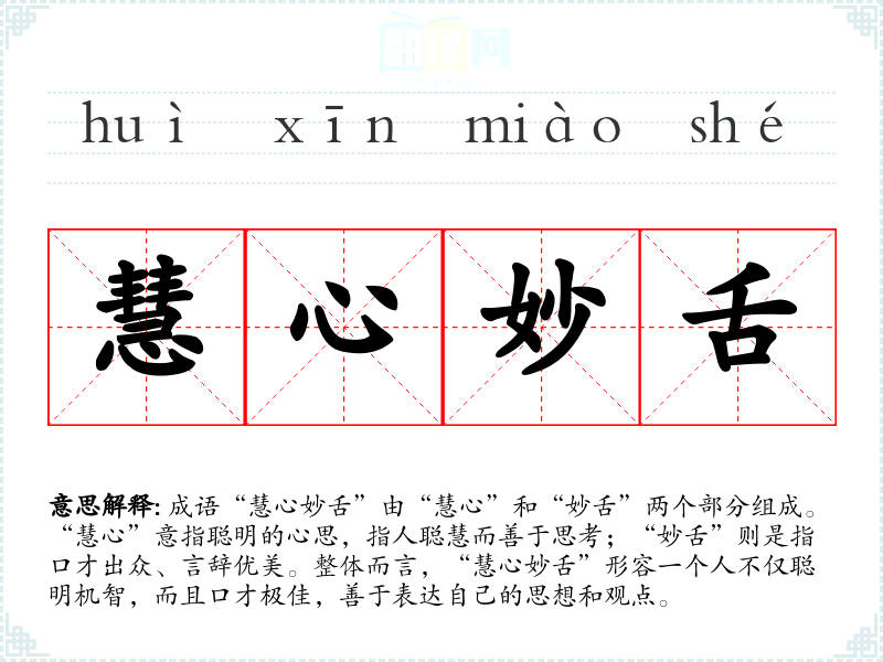 成语“慧心妙舌”由“慧心”和“妙舌”两个部分组成。“慧心”意指聪明的心思,指人聪慧而善于思考;“妙舌”则是指口才出众、言辞优美。整体而言,“慧心妙舌”形容一个人不仅聪明机智,而且口才极佳,善于表达自己的思想和观点。