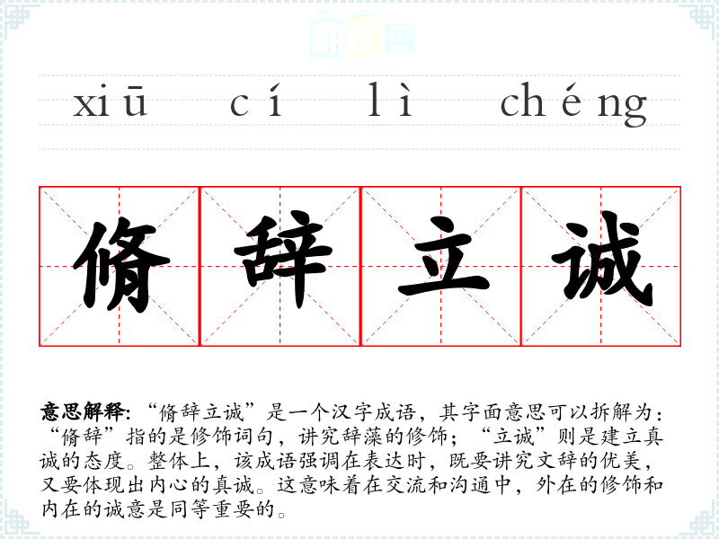 | 脩辞立诚 | 原指整顿文教,树立诚信,后多用以指撰文要表达作者的真实意图,不可作虚饰浮文。 |