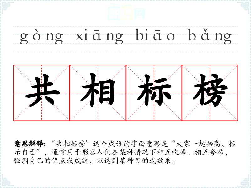“共相标榜”这个成语的字面意思是“大家一起抬高、标示自己”,通常用于形容人们在某种情况下相互吹捧、相互夸耀,强调自己的优点或成就,以达到某种目的或效果。