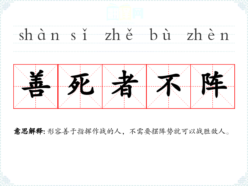 | 善死者不阵 | 形容善于指挥作战的人,不需要摆阵势就可以战胜敌人。 |