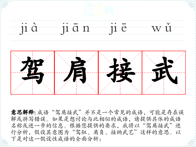 “驾肩接武”可以理解为“驾驭肩上的责任,接纳武艺”。它的字面意思可以解释为善于承担责任,并能够掌握和应用武艺或技能。整体表达出一种积极向上的态度,强调勇于担当和不断学*。