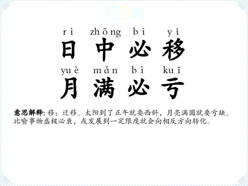 移:迁移。太阳到了正午就要西斜,月亮满圆就要亏缺。比喻事物盛极必衰,或发展到一定限度就会向相反方向转化。 |