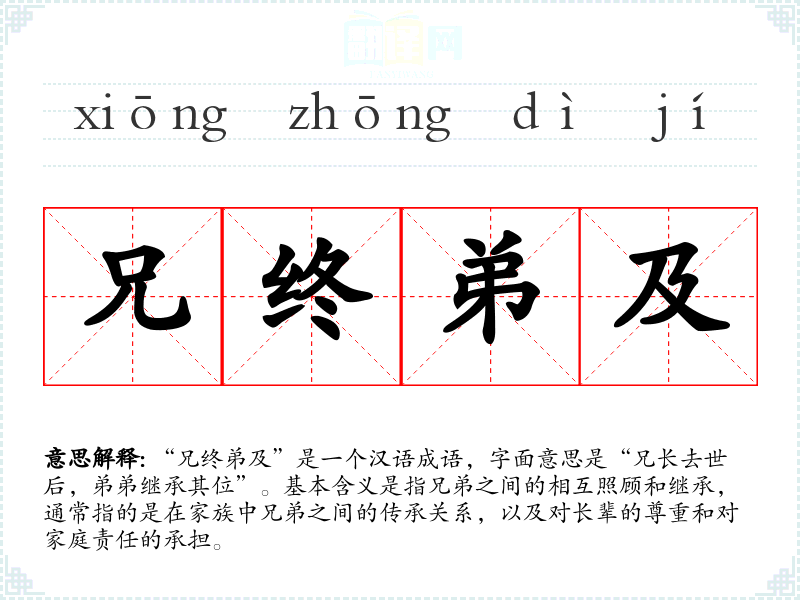 “兄终弟及”是一个汉语成语,字面意思是“兄长去世后,弟弟继承其位”。基本含义是指兄弟之间的相互照顾和继承,通常指的是在家族中兄弟之间的传承关系,以及对长辈的尊重和对家庭责任的承担。