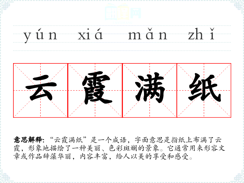 “云霞满纸”并没有一个特定的历史典故,但它可以看作是对自然美景的描绘,常常与古代诗词中对云彩和霞光的赞美相联系。在古代文学中,云霞常常象征着美丽、吉祥和希望,因此这个成语的使用也蕴含了对这些美好品质的追求。