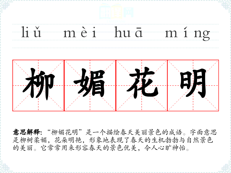 | 柳媚花明 | 媚:美好、可爱。绿柳成荫,繁花似锦。形容美好的春光。 |