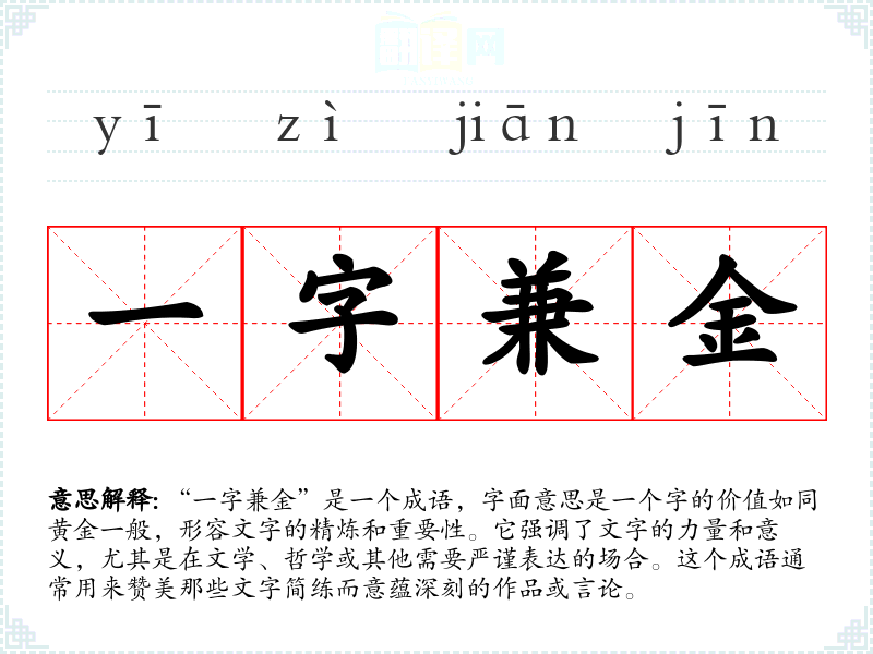 - 反义成语:长篇大论、空话连篇。与“一字兼金”相对,强调内容冗长、没有实质性意义的表达。