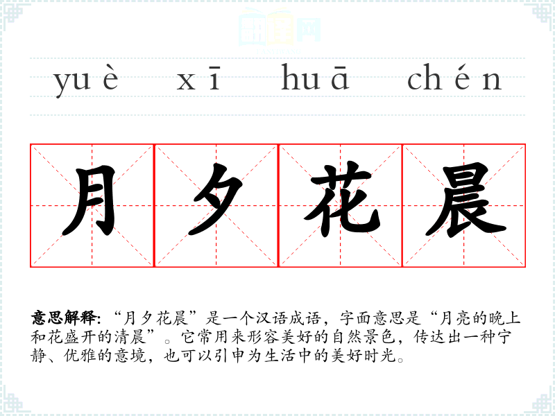 “月夕花晨”是一个汉语成语,字面意思是“月亮的晚上和花盛开的清晨”。它常用来形容美好的自然景色,传达出一种宁静、优雅的意境,也可以引申为生活中的美好时光。