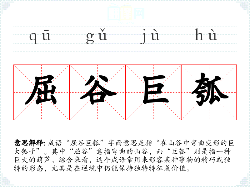 成语“屈谷巨瓠”字面意思是指“在山谷中弯曲变形的巨大瓠子”。其中“屈谷”意指弯曲的山谷,而“巨瓠”则是指一种巨大的葫芦。综合来看,这个成语常用来形容某种事物的精巧或独特的形态,尤其是在逆境中仍能保持独特特征或价值。