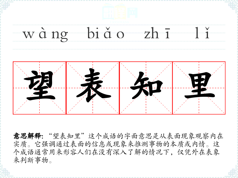 “望表知里”这个成语的字面意思是从表面现象观察内在实质。它强调通过表面的信息或现象来推测事物的本质或内情。这个成语通常用来形容人们在没有深入了解的情况下,仅凭外在表象来判断事物。