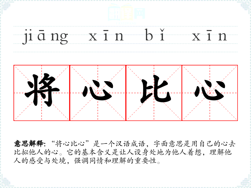 “将心比心”是一个汉语成语,字面意思是用自己的心去比拟他人的心。它的基本含义是让人设身处地为他人着想,理解他人的感受与处境,强调同情和理解的重要性。