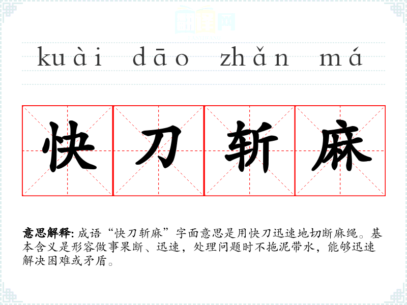 成语“快刀斩麻”字面意思是用快刀迅速地切断麻绳。基本含义是形容做事果断、迅速,处理问题时不拖泥带水,能够迅速解决困难或矛盾。