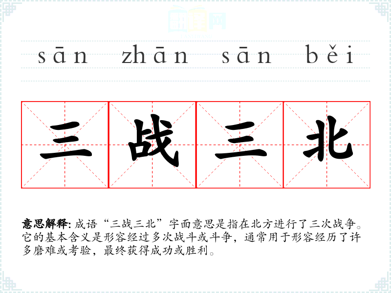 “三战三北”出自**历史中的一些军事典故,具体的历史背景可能与古代的战役有关,但并没有一个明确的文献记载。可以推测,这个成语体现了古代军事斗争中,统帅在面对强敌时的坚定决心和不屈不挠的精神。
