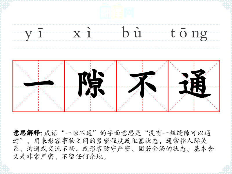 成语“一隙不通”的字面意思是“没有一丝缝隙可以通过”,用来形容事物之间的紧密程度或阻塞状态,通常指人际关系、沟通或交流不畅,或形容防守严密、固若金汤的状态。基本含义是非常严密、不留任何余地。