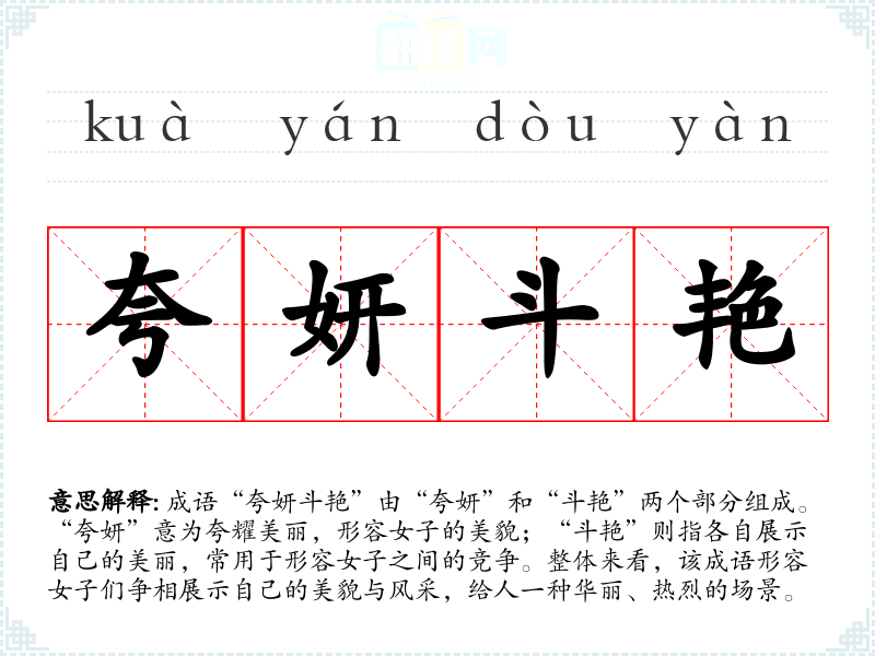 成语“夸妍斗艳”由“夸妍”和“斗艳”两个部分组成。“夸妍”意为夸耀美丽,形容女子的美貌;“斗艳”则指各自展示自己的美丽,常用于形容女子之间的竞争。整体来看,该成语形容女子们争相展示自己的美貌与风采,给人一种华丽、热烈的场景。