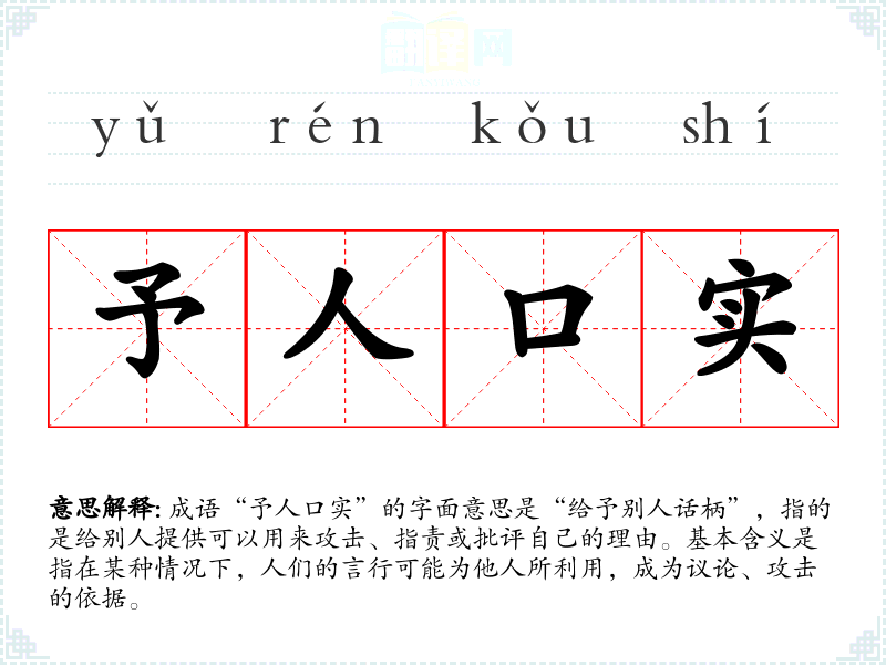 成语“予人口实”的字面意思是“给予别人话柄”,指的是给别人提供可以用来攻击、指责或批评自己的理由。基本含义是指在某种情况下,人们的言行可能为他人所利用,成为议论、攻击的依据。