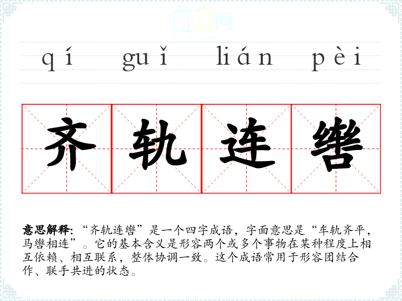 “齐轨连辔”是一个四字成语,字面意思是“车轨齐平,马辔相连”。它的基本含义是形容两个或多个事物在某种程度上相互依赖、相互联系,整体协调一致。这个成语常用于形容团结合作、联手共进的状态。