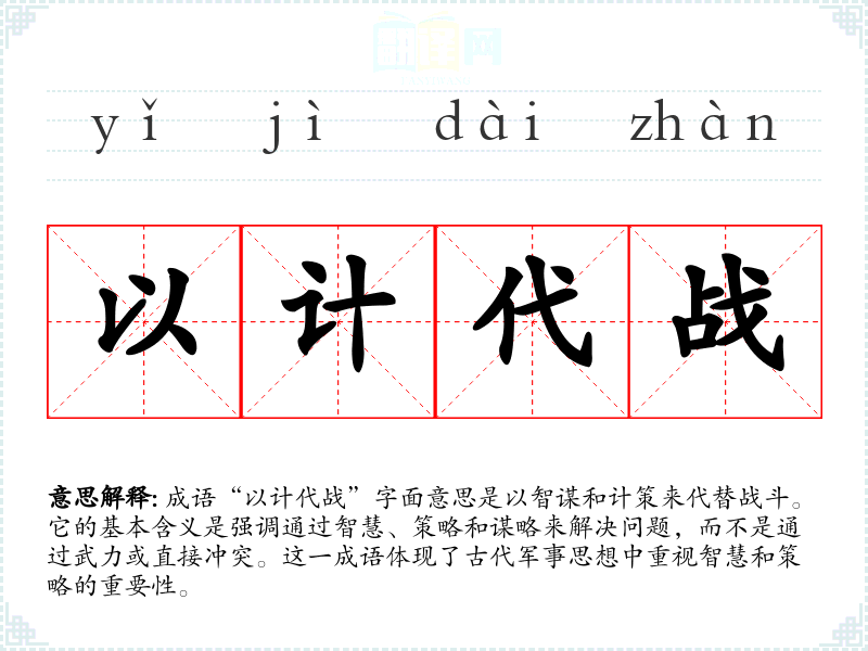 在**传统文化中,智慧和策略被高度重视,尤其在军事和政治领域。“以计代战”不仅在古代战争中适用,现代社会中,尤其是在商业竞争、外交谈判和人际关系中,也同样适用。这一成语传达了通过智慧实现目标的价值观。