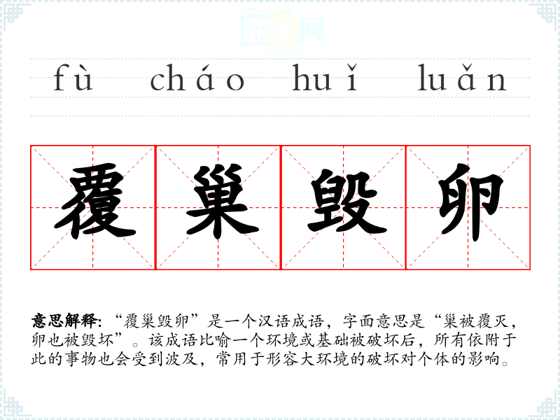 “覆巢毁卵”是一个汉语成语,字面意思是“巢被覆灭,卵也被毁坏”。该成语比喻一个环境或基础被破坏后,所有依附于此的事物也会受到波及,常用于形容大环境的破坏对个体的影响。