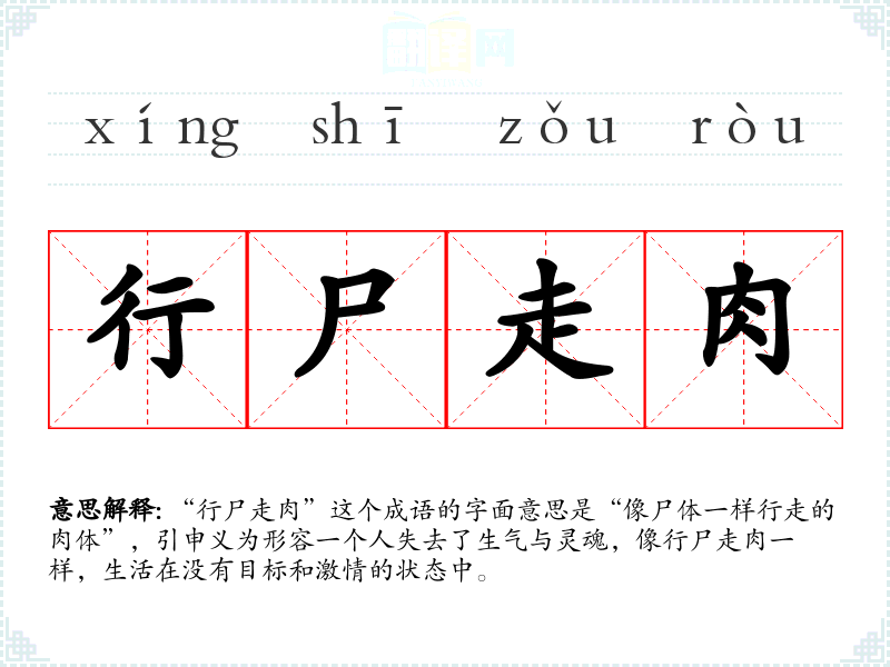 “行尸走肉”这个成语的字面意思是“像尸体一样行走的肉体”,引申义为形容一个人失去了生气与灵魂,像行尸走肉一样,生活在没有目标和激情的状态中。