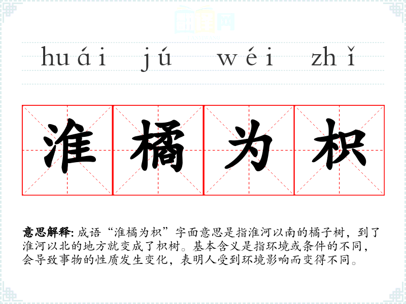 成语“淮橘为枳”字面意思是指淮河以南的橘子树,到了淮河以北的地方就变成了枳树。基本含义是指环境或条件的不同,会导致事物的性质发生变化,表明人受到环境影响而变得不同。