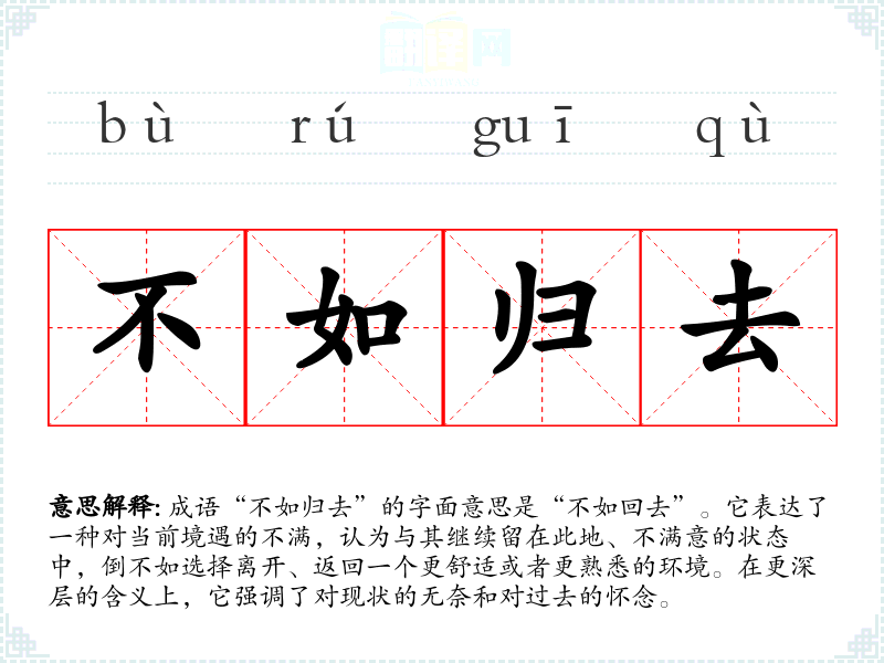 成语“不如归去”的字面意思是“不如回去”。它表达了一种对当前境遇的不满,认为与其继续留在此地、不满意的状态中,倒不如选择离开、返回一个更舒适或者更熟悉的环境。在更深层的含义上,它强调了对现状的无奈和对过去的怀念。
