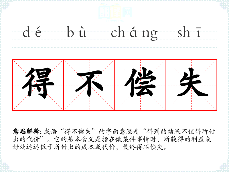 成语“得不偿失”的字面意思是“得到的结果不值得所付出的代价”。它的基本含义是指在做某件事情时,所获得的利益或好处远远低于所付出的成本或代价,最终得不偿失。