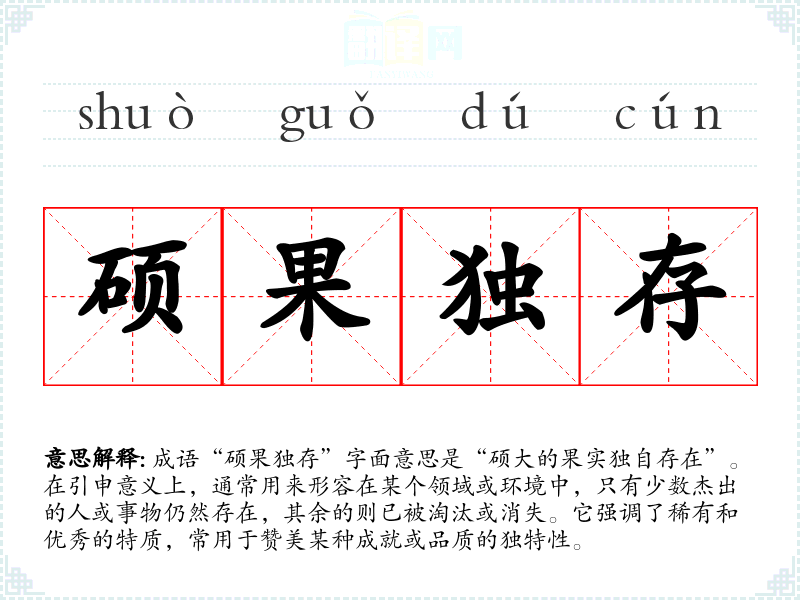 成语“硕果独存”字面意思是“硕大的果实独自存在”。在引申意义上,通常用来形容在某个领域或环境中,只有少数杰出的人或事物仍然存在,其余的则已被淘汰或消失。它强调了稀有和优秀的特质,常用于赞美某种成就或品质的独特性。