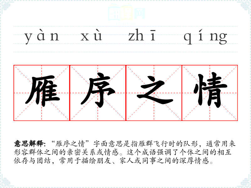 “雁序之情”字面意思是指雁群飞行时的队形,通常用来形容群体之间的亲密关系或情感。这个成语强调了个体之间的相互依存与团结,常用于描绘朋友、家人或同事之间的深厚情感。